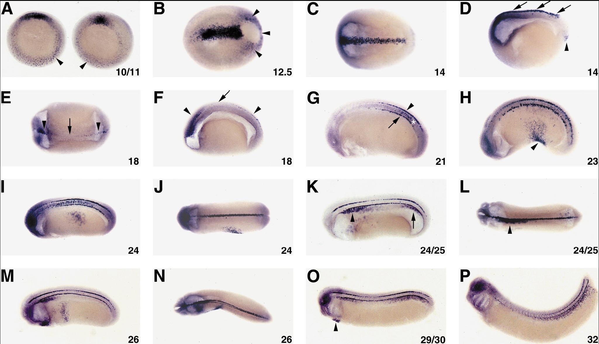FIG. 2. Xlefty expression during Xenopus development. (AâP) Whole-mount in situ localization of Xlefty transcripts at gastrula through