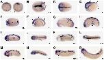 anterior at left. (C, D), (E, F), (I, J), and (M, N) show a dorsal and a left lateral view of the same embryo. Stage of embryo(s) depicted is shown