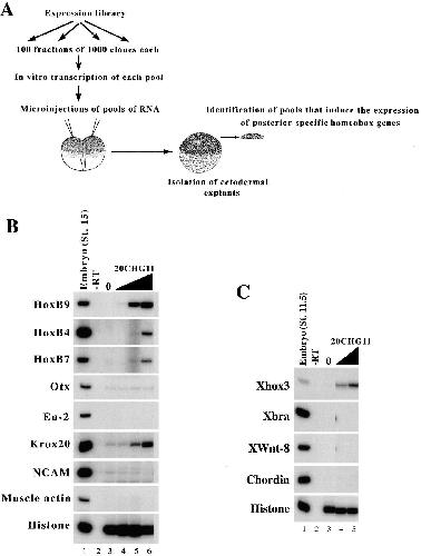 (A) Expression screening strategy. A gastrula expression library was divided into 100 fractions of 1000 clones each, and mRNA was synthesized from each pool by in vitro transcription. The synthetic RNA was injected into animal poles of two-cell stage embryos, and ectodermal explants were isolated at blastula stages. The positive pools were identified by analyzing the expression of posterior-specific genes at neurula stages by RT-PCR.