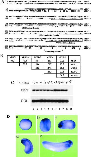 (A) Alignment of amino acid sequences between xE2F and human E2F-3 (hE2F-3). The sequences were aligned by DNASTAR MegAlign software (DNASTAR Inc.). Identical amino acids and gaps are shown as dots and dashes, respectively. The amino acid number is shown at left. Functional domains are indicated by double-headed arrows.