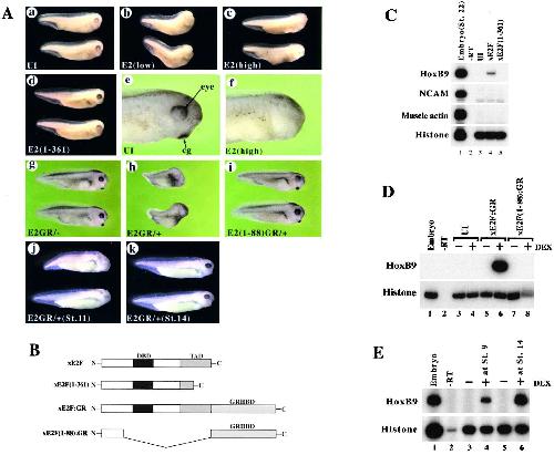 (E) Activation of xE2F:GR at neurula stages is able to induce the expression of HoxB9. Ectodermal explants expressing xE2F:GR were isolated at blastula stage and cultured in the presence of DEX at stages indicated. The expression of the HoxB9 gene was detected by RT-PCR 2 hr after the DEX treatment.