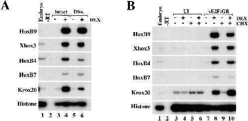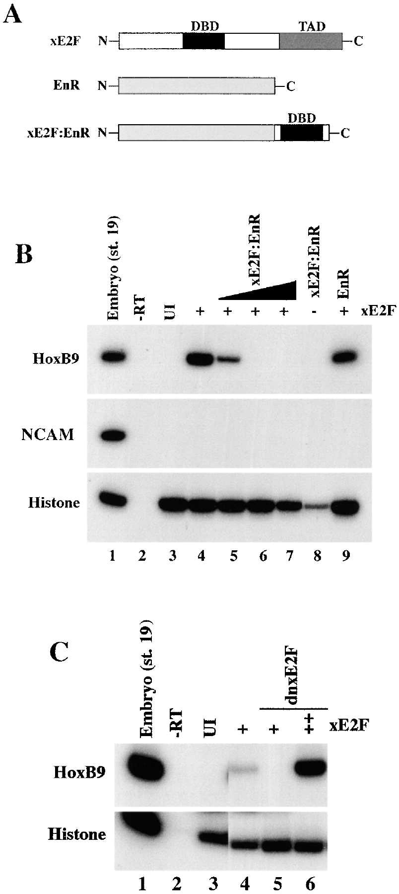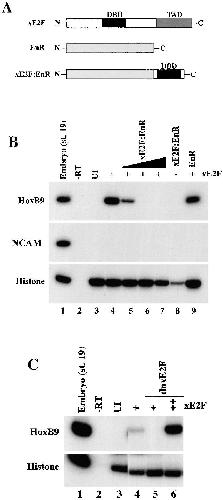 (C) Suppression of xE2F function by xE2F:EnR (dnxE2F) is rescued by increasing amounts of xE2F. The induction of HoxB9 expression by 0.15 ng of xE2F RNA is suppressed by coinjection of 30 pg of dnxE2F. This suppression is rescued by injection of 0.6 ng xE2F RNA.