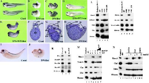 Uninjected embryos are shown in (A) as a control. The dnxE2F RNA (120 pg) was injected into the ventral or dorsal side of four-cell stage embryos (B and C, respectively), and the injected embryos were developed to tadpole stages. The injected embryos showed defects in trunk and posterior regions, but not in anterior regions. The effect of dnxE2F on normal development was partially rescued by coinjection of wild-type xE2F RNA (0.5 ng) (D and E). Cont, control; DN/ven, dnxE2F RNA into ventral side; DN/dor, dnxE2F RNA into dorsal side; DN+WT/ven, dnxE2F RNA with wild-type xE2F RNA into ventral side; DN+WT/dor, dnxE2F RNA with wild-type xE2F RNA into dorsal side. (FâH) Histological section of control and dnxE2F-injected embryos. ne, neural tube; m, muscle; no, notochord. (I and J) Overexpression of dnxE2F affects the expression of the spinal cord marker HoxB9. dnxE2F RNA (120 pg) was injected into the dorsal side of four-cell stage wild-type embryos and subjected to whole-mount in situ hybridization with an antisense HoxB9 probe at tadpole stages. Anterior side of embryos is to the left. Cont, control; DN/dor, dnxE2F RNA into dorsal side. (K) Inhibition of Hox gene expression by dnxE2F. Embryos injected dorsally with dnxE2F RNA (120 pg) were developed to tailbud stage (stage 25), and two embryos each were subjected to RT-PCR analysis. (L) Inhibition of xE2F function in marginal zone explants dorsalizes ventral mesoderm. dnxE2F RNA (120 pg) was injected into the ventral side of four-cell stage embryos, and dorsal and ventral marginal zone (DMZ and VMZ) explants were excised at early gastrula stages. The explants were subjected to RT-PCR analysis at midgastrula (stage 11) and tailbud (stage 27) stages. DN, dnxE2F RNA. (M) Wild-type xE2F rescues dorsalization of ventral mesoderm caused by dnxE2F. dnxE2F RNA (120 pg) was injected with increasing amounts of wild-type xE2F RNA (2.5 ng and 5.0 ng in lanes 6 and 7, respectively). DMZ and VMZ explants are isolated at early gastrula stages and subjected to RT-PCR at midgastrula stages. MZ, marginal zone; D, dorsal; V, ventral. (N) xE2F affects mesoderm formation induced by growth factors. Xenopus embryos were injected either with 60 pg (lanes 5 and 8) or 120 pg (lanes 6, 9, and 11) dnxE2F RNA into animal poles of two-cell stage embryos. Ectodermal explants from blastulae were treated with activin (supplied as oocyte supernatant; see Experimental Procedures) or FGF (100 ng/ml) and subjected to RT-PCR analysis at early gastrula stages. For BMP4 treatments, BMP4 RNA (0.5 ng) was coinjected with dnxE2F RNA.
