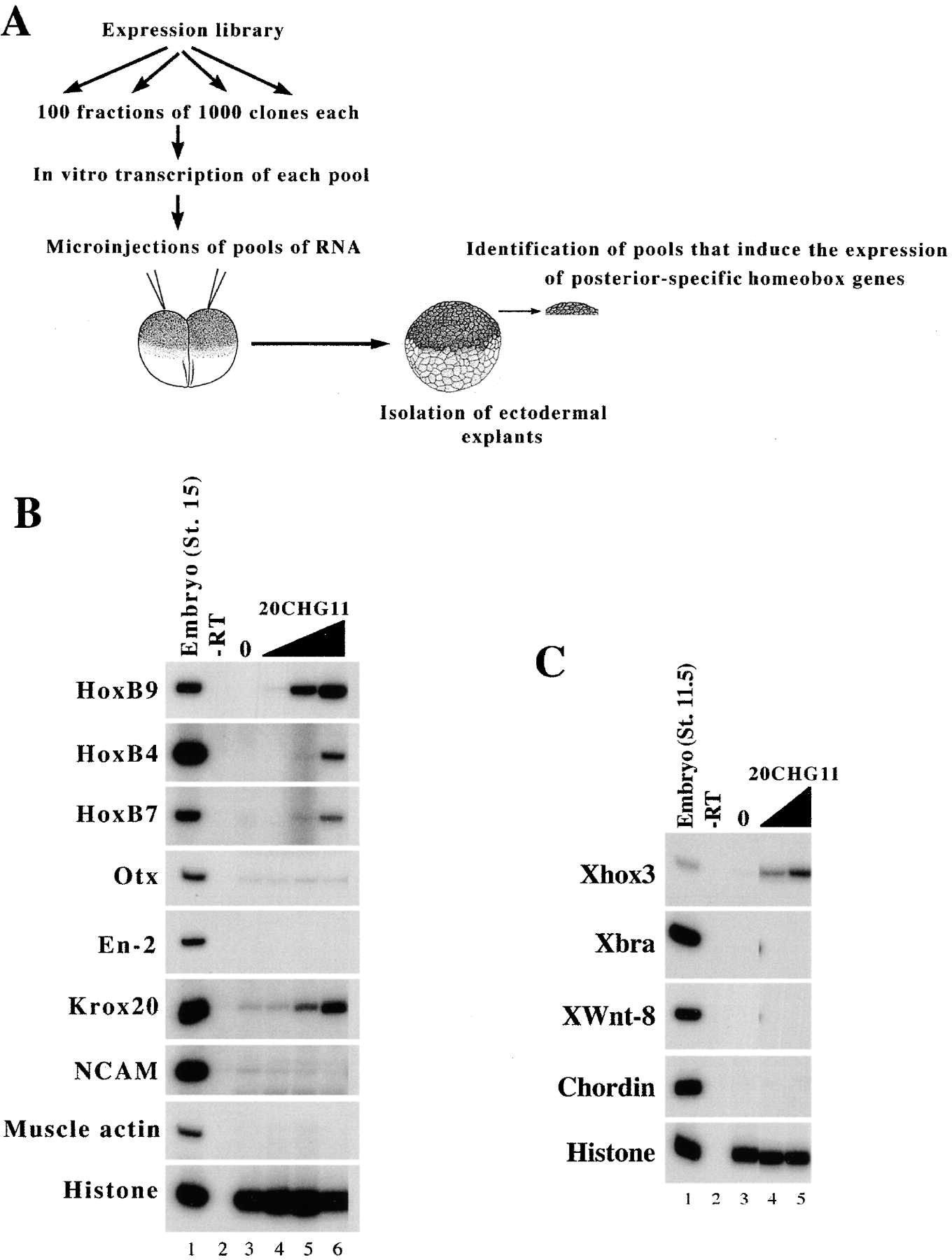 (B) Differing amounts of 20CHG11 RNA (0â5 ng) were injected into animal poles of two-cell embryos (lanes 3â6). Ectodermal explants were isolated at blastula stages and subjected to RT-PCR analysis at neurula stages (stage 15). âRT indicates sibling control embryos processed without reverse transcriptase. Histone was used as a loading control.