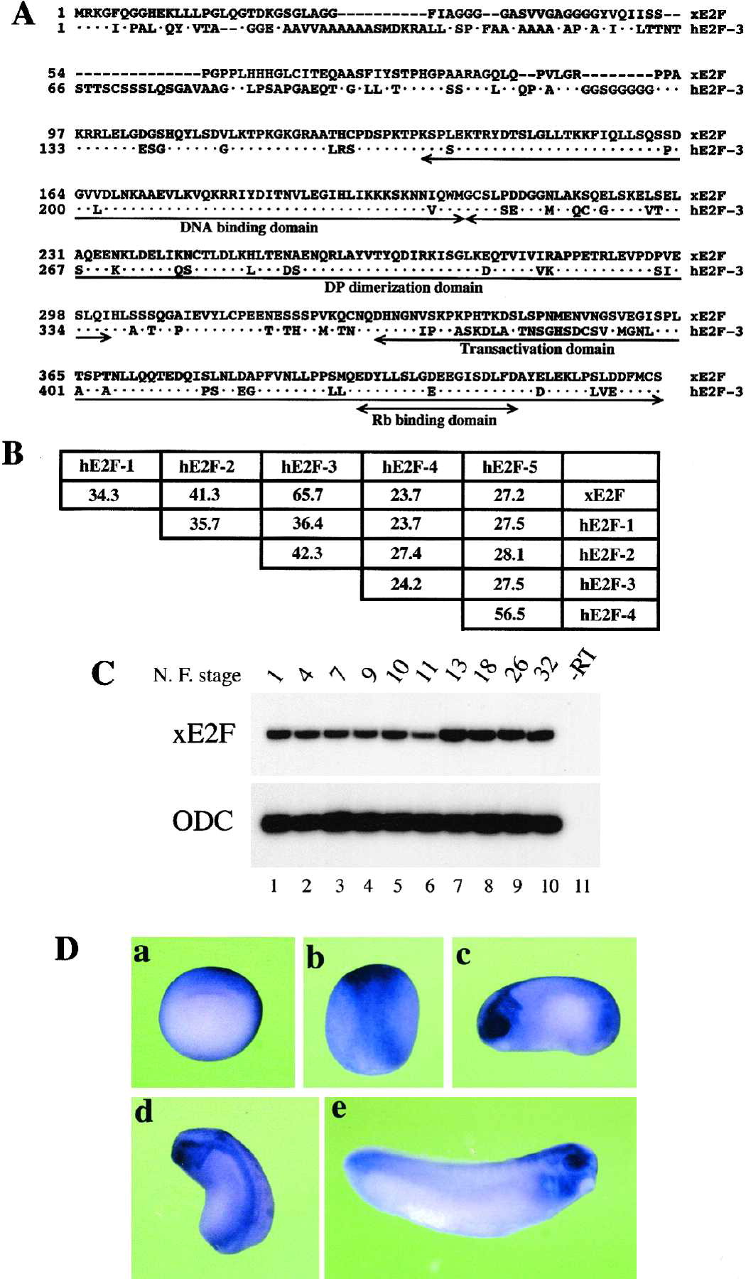 (C) Expression of the xE2F gene during early Xenopus embryogenesis. Expression of xE2F was detected by RT-PCR. ODC was used for a loading control; the stage 32 embryos processed without reverse transcriptase in the RT-PCR reaction are indicated as âRT.