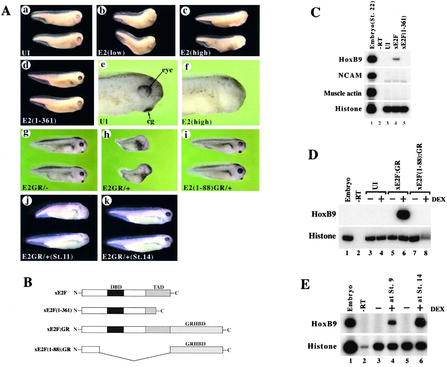(A) Two different doses of xE2F RNA (2.5 or 5.0 ng) were injected into all four animal pole blastomeres of 8-cell embryos (aâf). The injected embryos show relatively small eyes at a low dose (b) and lack both eyes and cement glands at a high dose (c and f). Injection of xE2F(1â361) RNA (5.0 ng) did not affect normal development (d). Uninjected embryos are shown as a control (a and e). The anterior region of an xE2F RNAâinjected embryo (f) is compared to that of an uninjected embryo (e). Eyes (eye) and cement gland (cg) are indicated. UI, uninjected; E2(low), 2.5 ng of xE2F; E2(high), 5.0 ng of xE2F; E2(1-361), 5.0 ng of xE2F(1-361). (gâi) Effect of xE2F:GR on the anteriorâposterior axis of Xenopus embryos. Either xE2F:GR or xE2F(1â88):GR RNA (2.5 ng each) was injected into animal poles of four-cell embryos. The injected embryos were developed to late blastula stages, and then cultured with or without 20 μM DEX. xE2F:GR affects normal development when it is stimulated by DEX treatment (h). Even after DEX treatment, xE2F(1-88):GR does not affect normal development (i). (j and k) xE2F:GR is not able to affect normal development when activated at neurula stages. Embryos injected with xE2F:GR RNA (2.5 ng) were treated with DEX at gastrula (stage 11, j) and neurula (stage 14, k) stages. E2GR/â, xE2F:GR without DEX treatment; E2GR/+, xE2F:GR with DEX treatment; E2(1-88)GR/+, xE2F(1-88):GR with DEX treatment.