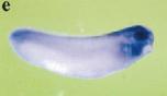 (D) Spatial expression pattern of xE2F transcripts in Xenopus embryos. (a) Vegetal view of a stage 10.5 embryo; dorsal is at top. (b) Dorsal view of a stage 14 embryo; anterior is at top. (c) Lateral view of a stage 25 embryo; dorsal is at top and anterior is at left. (d) Dorsal view of (c); anterior is at top. (e) Lateral view of stage 30; anterior is at right.