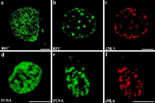 O'Keefe, Dynamic organization of DNA replication in mammalian cell nuclei: spatially and temporally defined replication of chromosome-specific alpha-satellite DNA sequences. 1992, Pubmed