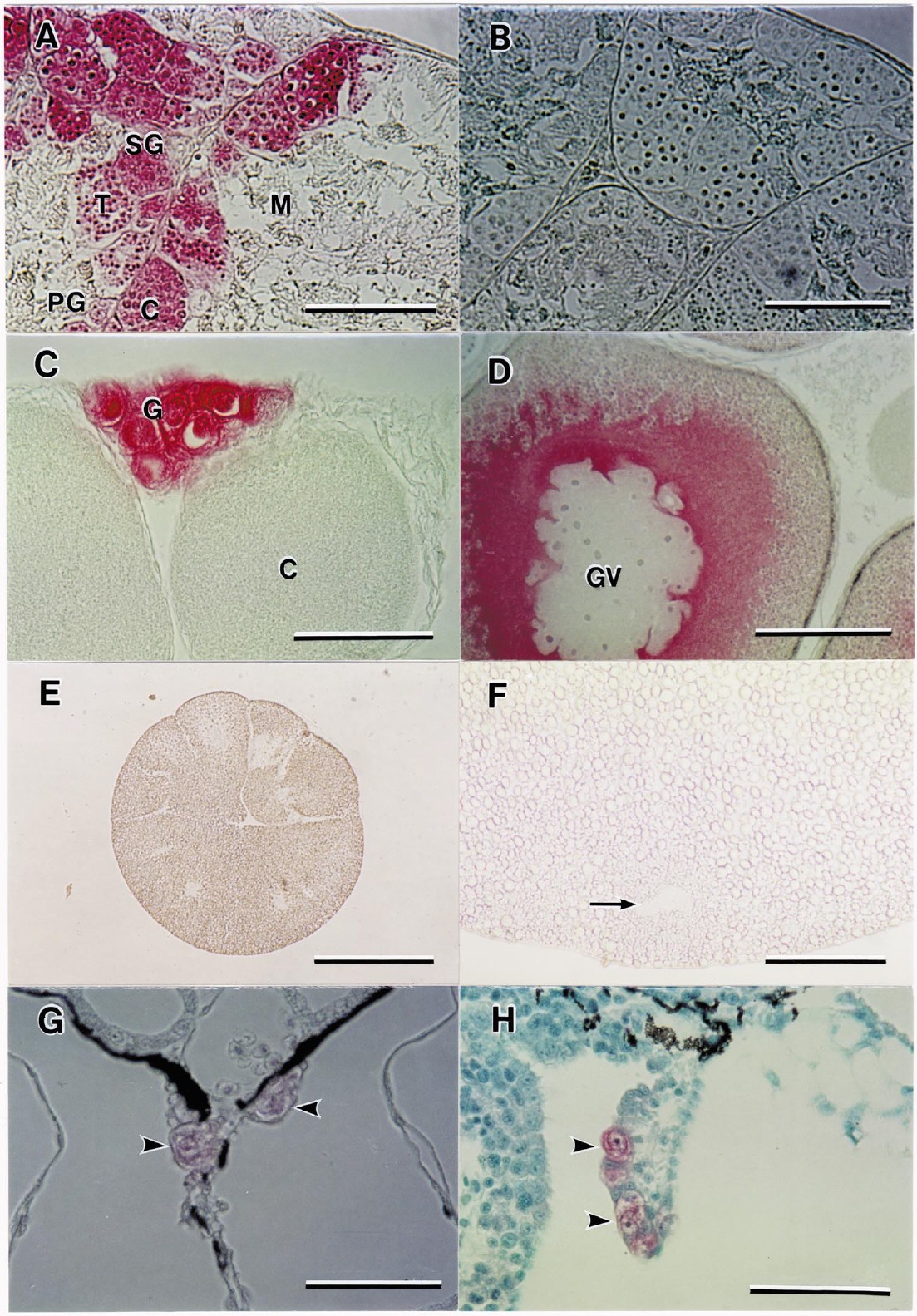 germ cells (arrowheads) in the stage 52 embryo. Scale, 500 mm (E); 100 mm (A,B,D,F); 50 mm (C,G,H).