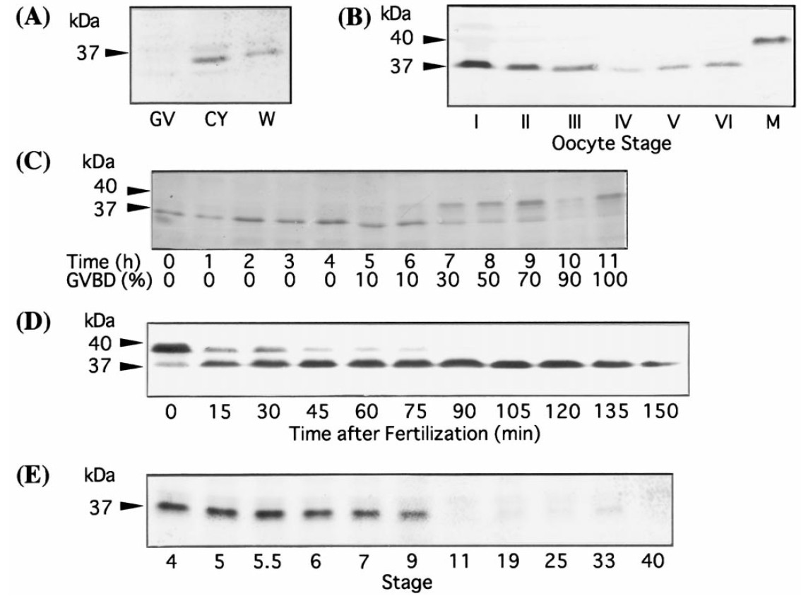Fig. 3. Immunoblotting analyses of Xdazl during oogenesis (A,B), oocyte maturation (C), and embryogenesis (D,E). (A) The localization of Xdazl in oocytecytoplasm. Extracts from the isolated germinal vesicle (GV), enucleated cytoplasm (CY) and whole oocyte (W) were analyzed. (B) Changes in the