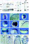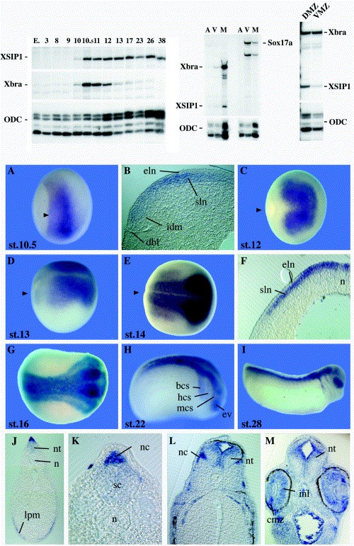 Fig. 2. Expression of XSIP1 during Xenopus development. (Top panels) RNase protection analysis of XSIP1 transcripts during embryogenesis and in dissected regions of stage 10.5 embryos compared with the expression of other genes. Abbreviations: E, eggs; A, animal pole; V, vegetal pole; M, marginal zone; DMZ, dorsal marginal zone; VMZ, ventral marginal zone. ODC (ornithine decarboxylase) is used as an internal control. (Bottom panels) Whole-mount in situ hybridization using XSIP1 antisense RNA. NieuwkoopâFaber stages of embryogenesis are indicated. All embryos are shown with anterior region to the right. (A,C,E,G) Dorsal view; (D,H,I) lateral view. (B) Sagittal section of the embryo show in (A). (F) Transversal section of the embryo shown in (E). (JâL) Transversal sections of the embryo shown in I at the level of the trunk (J,K, high magnification) or hindbrain (L). (M) Transversal section at the level of the eyes of a stage 37 embryo. The arrowheads show the dorsal lip in (A) and the closing blastopore in (CâE). Abbreviations: bcs, branchial crest segment; cmz, ciliary marginal zone; dbl, dorsal blastopore lip; eln, epithelial layer of neurectoderm; hcs, hyoid crest segment; idm, involuting dorsal mesoderm; inl, inner nuclear layer; lpm, lateral plate mesoderm; mcs, mandibular crest segment; n, notochord; nc, neural crest; nt, neural tube; sc, spinal cord; sln, sensorial layer of neurectoderm.