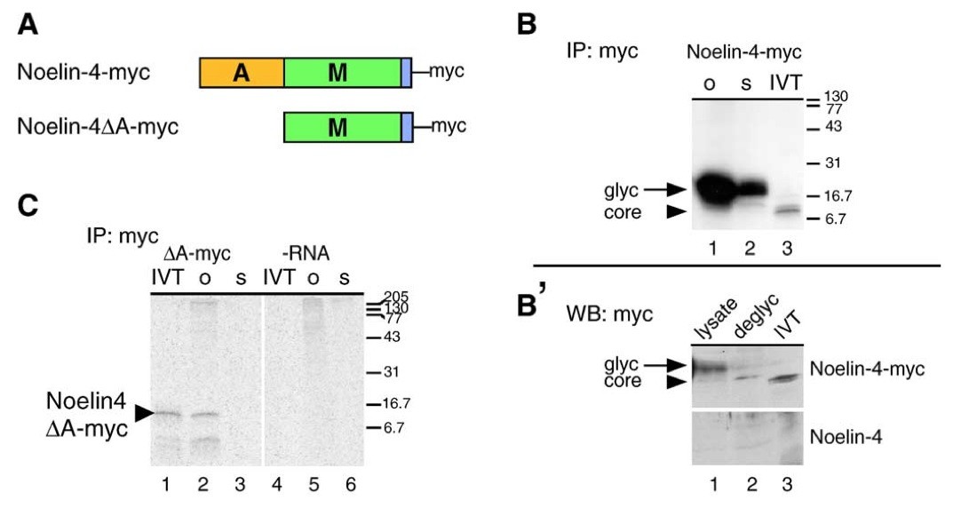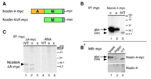 Fig. 2. Noelin-4 is a secreted, glycosylated protein. (A) Noelin constructs used in these studies are shown schematically. Noelin-4 was myc-tagged at the carboxy terminal. Noelin-4DA-myc is Noelin-4-myc with the A exon removed. (B) Noelin-4-myc was immunoprecipitated from oocyte (o, lane 1) and supernatant (s, lane 2) fractions. In vitro-translated protein (IVT) is shown in lane 3. Oocyte and supernatant fractions contain Noelin-4 protein that is larger than the size of in vitro- translated core protein. (BV) Anti-myc Western blot of embryos injected with Noelin-4-myc or Noelin-4 (for a Western blot control) as indicated. Proteins were run on SDS-PAGE either as embryo lysate (lane 1), lysate treated with PNGase F (deglyc, lane 2) or in vitro-translated protein (IVT, lane 3). Proteins in the deglycosylated sample collapsed to the size of in vitro-translated protein. (C) Noelin-4DA-myc immunoprecipitated from the oocyte fraction only, and was not found in the supernatant fraction (lane 2 versus lane 3). Control oocytes and supernatant are shown in lanes 4-6.