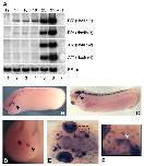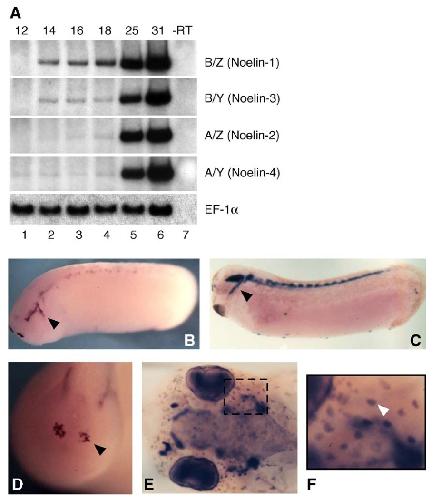 Fig. 3. Developmental expression patterns of Noelins. (A) Noelin temporal expression patterns. Embryos were harvested at the stages indicated and examined for the presence of the specific Noelin isoforms by RT-PCR. EF1a is a loading control, -RT is a control for genomic DNA contamination. Primer pairs used hybridize to only one splice variant each, as indicated. Noelin expression is observed weakly from neural plate stages, with strong expression from late neurula stages. (B-F) Spatial expression pattern of Noelin-3/4 (Y exon in situ hybridization, purple staining). Anterior is to the left. (B) Side view of stage 27 embryo with staining in cranial ganglia (arrowhead) and spinal cord; (C) stage 29 embryo with staining in trigeminal ganglion (arrowhead) and spinal cord; (D) anterior view of stage 26 embryo highlighting olfactory placode expression (arrowhead); (E) dorsal view of stage 42 embryo with staining in cranial ganglia, eye, and neuromasts; (F) magnification of boxed region in panel D showing neuromast expression (arrowhead).