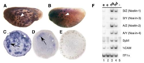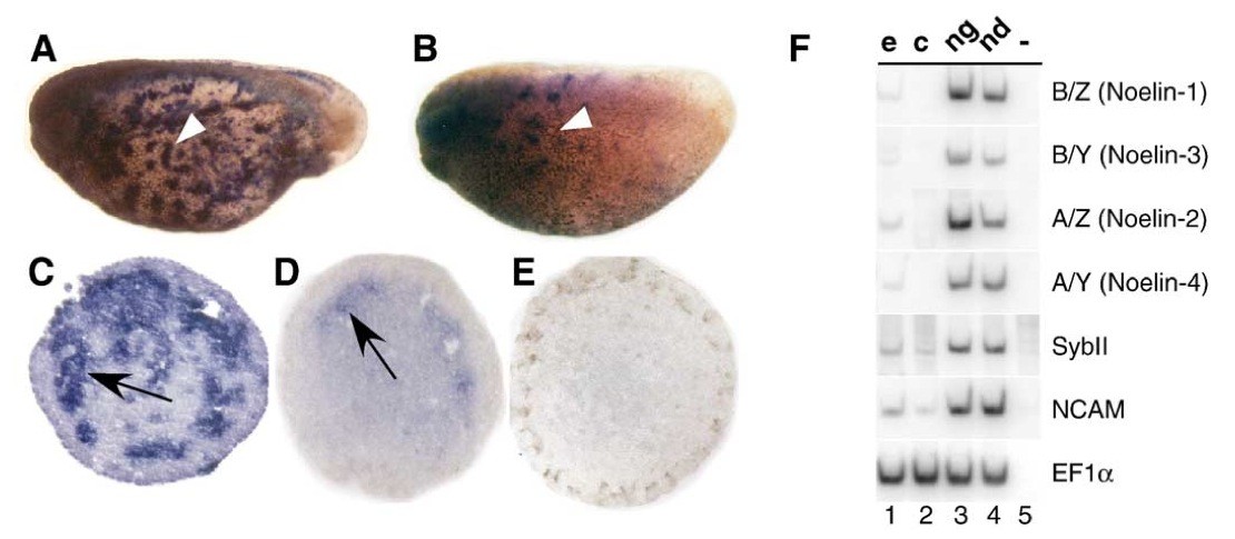 Fig. 4. Noelin-3 and -4 are induced by neurogenin. (A, B) Embryos were injected in one cell at the two-cell stage with 100 pg of X-ngnr-1 and cultured to stage 24. Whole mount in situ hybridization for N-tubulin (A) or the Y exon of Noelin-3 and -4 (B) is shown. Ectopic neurons staining with the markers are indicated with arrowheads. (C-E) cross-sections of animal caps from embryos injected with 100 pg X-ngnr-1 or lacZ in 2/2 cells, excised at stage 9 and cultured to stage 22. Arrows point to regions staining with the markers. (C) N-tubulin staining; (D) Y exon staining; (E) lacZ-injected, N-tubulin staining. Embryos for this experiment were derived from pigmented mothers; brown color is due to pigment granules. (F) RT-PCR on stage 22 animal caps explanted at stage 10, derived from embryos injected with lacZ (c, lane 2), X-ngnr-1 (ng, lane 3), or XNeuroD (nd, lane 4), or on whole embryo controls (e, lane 1). Both XNeuroD and X-ngnr-1 induced expression of all four Noelin isoforms. RNA without reverse transcriptase was used as a negative control (-, lane 5). Primers used are indicated; each Noelin set hybridizes to only the indicated isoform. SybII = synaptobrevinII, a marker for differentiating neurons (Knecht et al., 1995).