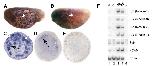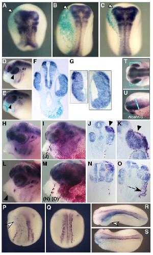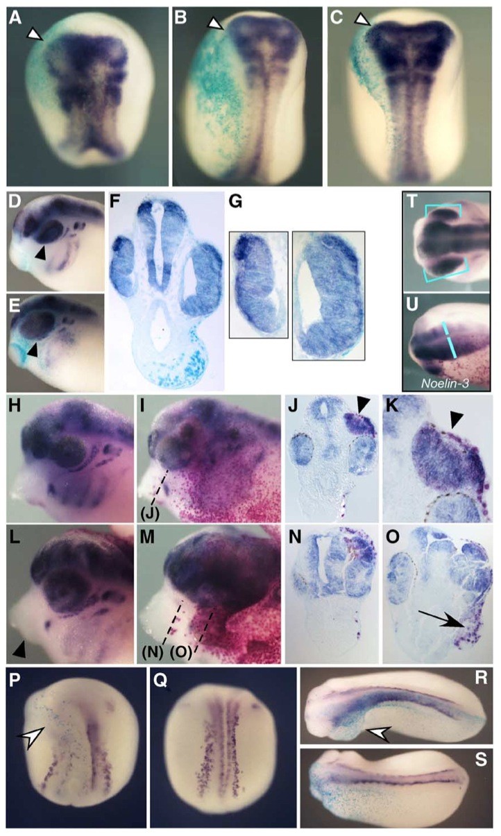 Fig. 5. Noelin-4 over-expression results in expansion of neural fate. Embryos injected with Noelin-4 exhibit enlarged and ectopic neural tissue. Embryos were injected with 500 pg (A - G, P - S) or 1 ng (H - O) of Noelin-4 mRNA, 500 pg Noelin-3 (T, U), and 100 pg of lac Z mRNA as a lineage tracer. h-galactosidase activity was assessed with X-gal (turquoise, A-G) or Magenta-Gal (magenta, H-O) and embryos were stained for Sox-2 expression. (A-C) Neural plate stage embryos injected with (A) Noelin-4 (AMY), (B) Noelin-2 (AMZ) or (C) lacZ. Injected side is to the left, embryos are photographed from the dorsal side, oriented with anterior pointing up. Anterior neural plate is indicated with an arrowhead. Note expansion of the neural plate in panel A. (D - G) Embryos were harvested at stage 29 and stained for Sox-2 expression. (D) Control side, (E) injected side of same embryo. Neural retina is revealed by Sox-2 staining, note that injected side eye is larger than control side (arrowheads). (F) Cross section through midbrain region; (G) comparison of neural retinas from both sides of the embryo magnified to the same degree. (H - O) Examples of embryos harvested at stage 35 and stained for Sox-2 expression. (H, L) Control side; (I, M) injected side. Panels J, N, and O are cross- sections through the head regions with the section level indicated on panels I and M. Panel K is a magnification of the injected side in panel J. Note expansion of neural tissue and ectopic Sox-2 staining (arrowhead). Panel O shows an ectopic cement gland ventral to the eye (arrow) that is discontinuous with the endogenous cement gland (see arrowhead in panel M). (P-S) N-tubulin staining of embryos injected with Noelin-4 (P, R) or Noelin-1 (Q, S). (P, Q) Neural plate stage embryos, with injected side to the left, anterior pointing to top. (R, S) Embryos at stage 24 with anterior to the left. Arrowheads indicate bulging tissue on the injected side in panels P, R. (T, U) Noelin-3 causes similar neural territory expansion. Noelin-3 (BMY) injection, Sox-2 staining. Bars and brackets outline width of neural structures in two different embryos on the injected side (bottom half) and uninjected control side (top half).