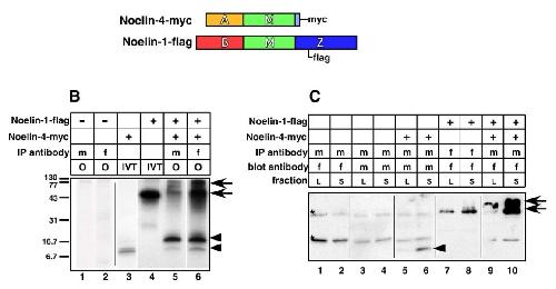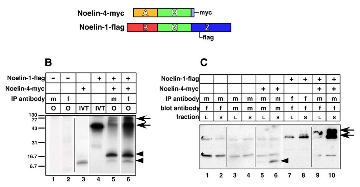 Fig. 7. Noelin-4 binds to Noelin-1. (A) Noelin-4-myc and Noelin-1-flag constructs used are shown diagrammatically. Noelin-1 bears an internal Flag epitope when designated with a plus sign (+), or is without a tag when designated with a minus sign (ï°). O, oocyte; IVT, in vitro-translated protein; m, myc; f, flag. (B) Co- immunoprecipitation assay in Xenopus oocytes. Oocytes were injected as indicated and cultured in the presence of 35S-methionine. Oocyte controls were injected with an untagged version of Noelin-1 and immunoprecipitated with either myc or flag (lanes 1, 2). In vitro-translated proteins (lanes 3, 4) are compared to oocyte- translated proteins (lanes 5, 6). Samples were immunoprecipitated with the indicated antibody (m = myc; f = flag). Noelin-4-myc is indicated with arrowheads; Noelin-1-flag is indicated with arrows. (C) IP-Western blot. COS-7 cells were transfected with the indicated plasmids and then immunoprecipitated with either myc or flag antibodies. Lysate (L) and supernatant (S) fractions were then resolved on SDS-PAGE and transferred to nitrocellulose before enhanced chemiluminescence detection with the indicated antibody. Some of the precipitating antibodies were also eluted during sample preparation; heavy and light-chain immunoglobulin bands detected with the Western secondary antibody are indicated with asterisks in control lane 1. Noelin-4-myc is denoted with an arrowhead; Noelin-1-flag is denoted with arrows. Myc pull-down of Noelin-4-myc samples brought down a band that immunoreacted with myc on the Western blot (arrowhead, lanes 5, 6), as did flag pull-down on samples transfected with Noelin-1-flag and subsequently blotted for flag (lanes 7, 8). Samples transfected with both plasmids and immunoprecipitated with anti-myc contained flag-immunoreactive bands at the size of Noelin-1-flag (arrows, lanes 9, 10).