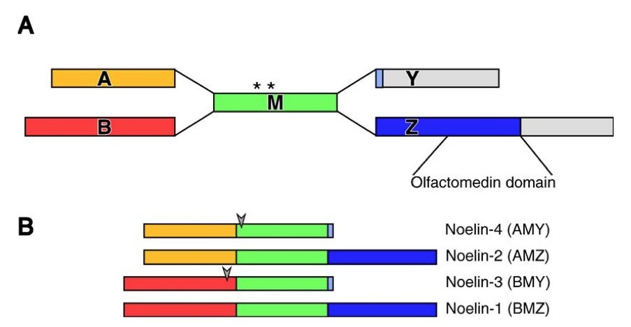 Fig. 1. Schematic diagram of Noelin isoform exon composition. (A) Noelins are made by differential promoter usage and alternative splicing. Exon structure was first elucidated in the rat by Danielson et al. (1994). The olfactomedin domain is indicated, as well as the location of the two cysteine residues conserved in all Noelins and homologous to cysteines in Olfactomedin that are responsible for disulfide bonding in multimerization (asterisks in M region). (B) Noelin exon terminology used in this work is shown, with predicted signal peptide cleavage sites indicated with arrowheads.