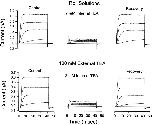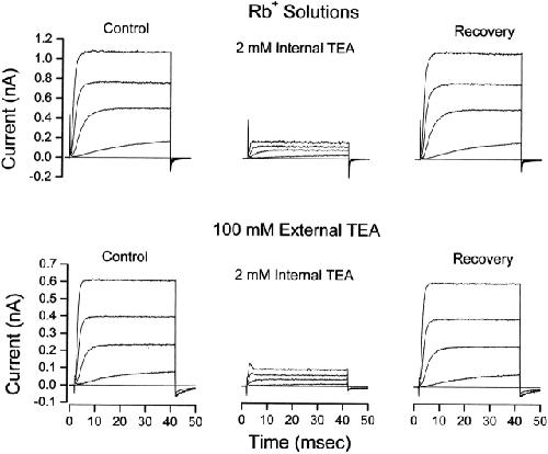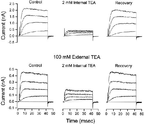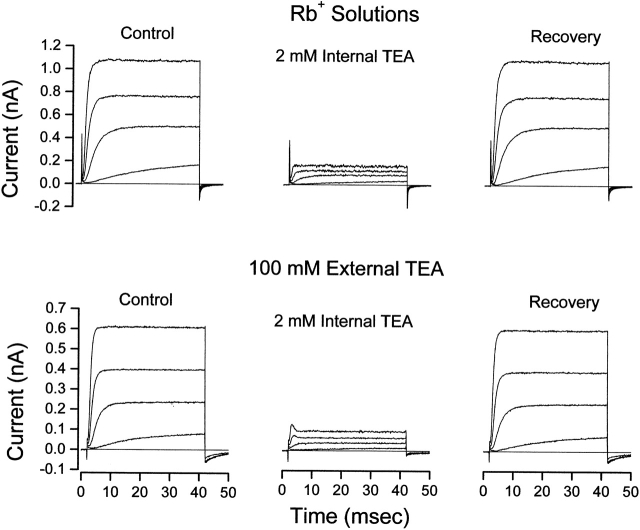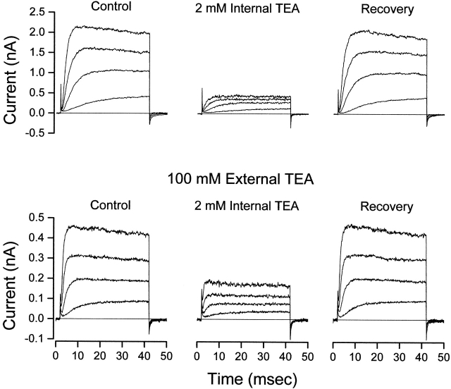 Figure 1. Internal TEA is less effective in the presence of external TEA. (Top) Shaker channel currents at several voltages before, during, and after recovery from application of 2 mM internal TEA with no TEA in the external solution. (Bottom) Currents from another patch before, during, and after recovery from application of 2 mM internal TEA with 100 mM TEA in the external solution. Currents elicited with 40-ms steps to voltages of −30, −10, +10, and +30 mV.