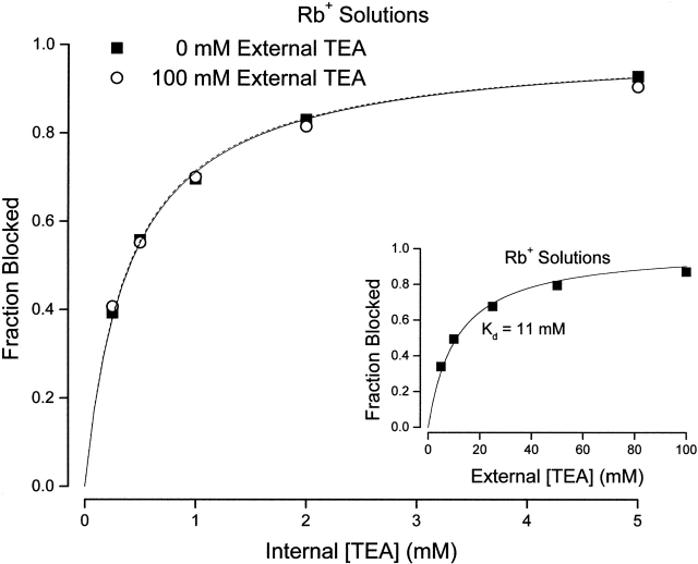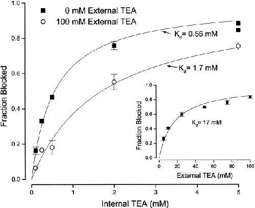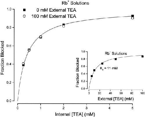 Figure 5. Channel block by internal TEA in the absence and presence of external TEA in Rb+ solutions. Fraction block of Shaker channel current by the indicated internal TEA concentrations in the absence (▪) and presence (○) of 100 mM external TEA. Currents measured at 0 mV. (Dotted line) Fit of to the data in the absence of external TEA with a Kd value of 0.4 mM. (Solid line) Fit of to the data in the presence of 100 mM external TEA with a Kd value of 0.41 mM. Mean values of three to four measurements. All standard error limits were smaller than the symbols. (Inset) Channel block by external TEA in the presence of Rb+ ions. Block of Shaker current at a potential of 0 mV at the indicated concentrations of external TEA. Mean values from three to four measurements. All standard error limits were smaller than the symbols. (Line) Best fit of to the data with the indicated dissociation constant.