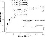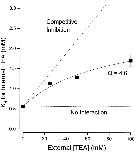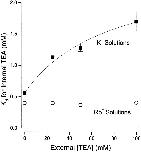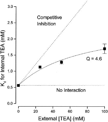 Figure 3. Interaction between external and internal TEA. Ordinate is the apparent dissociation constant for block by internal TEA at the indicated concentrations of external TEA. Error limits illustrated (when larger than symbol) are the estimated errors from the fitting routine (see methods). The dotted line is the expectation for no interaction between internal and external TEA. The dashed line is the expectation for competitive inhibition (). Solid line is the best fit of to the data with a value of Q of 4.6.