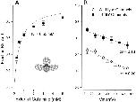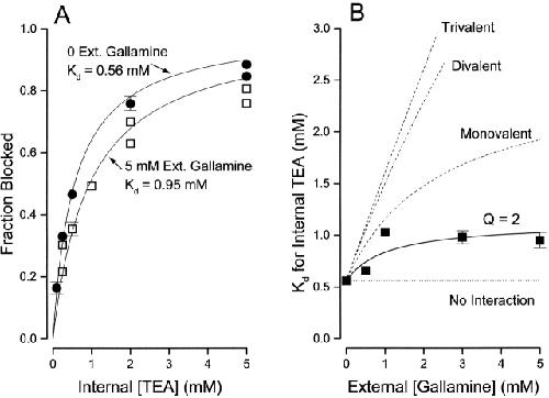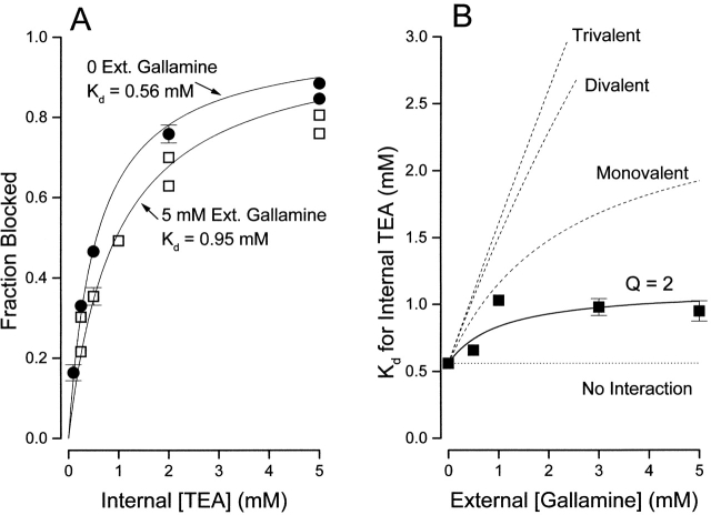 Figure 8. Interaction between external gallamine and internal TEA. (A) Block of Shaker channels (at 0 mV) by the indicated internal TEA concentrations in the absence (•) and presence (□) of 5 mM external gallamine. Lines are fits of to the data with the indicated Kd values. n = 2–5; duplicate values plotted individually, mean values (n = 3–5) with SEM limits only if larger than symbols. (B) Ordinate is the apparent dissociation constant for block by internal TEA at the indicated concentrations of external gallamine. Error limits illustrated (when larger than symbol) are the estimated errors from the fitting routine (see methods). Solid line is the best fit of to the data with a Q value of 2.0. The dashed lines illustrate the predicted effects of an external trivalent, divalent, and monovalent antagonist (see text for details).