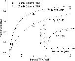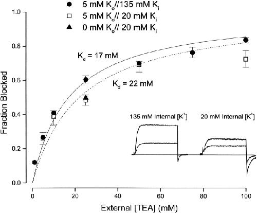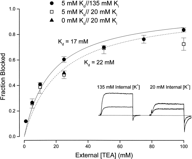 Figure 9. Interaction between external TEA and internal K+ ions. (Inset) Currents (at 0 mV) recorded with 135 mM (left) and 20 mM (right) internal K+ in the absence (larger current) and presence of 25 mM external TEA. (Main figure) Channel block (at 0 mV) at the indicated concentrations of external TEA in 135 mM (•) and 20 mM (□) internal K+. Block by 25 mM TEA was measured (▴) with 20 mM internal K+ and a nominally 0 K+ external solution (see methods).