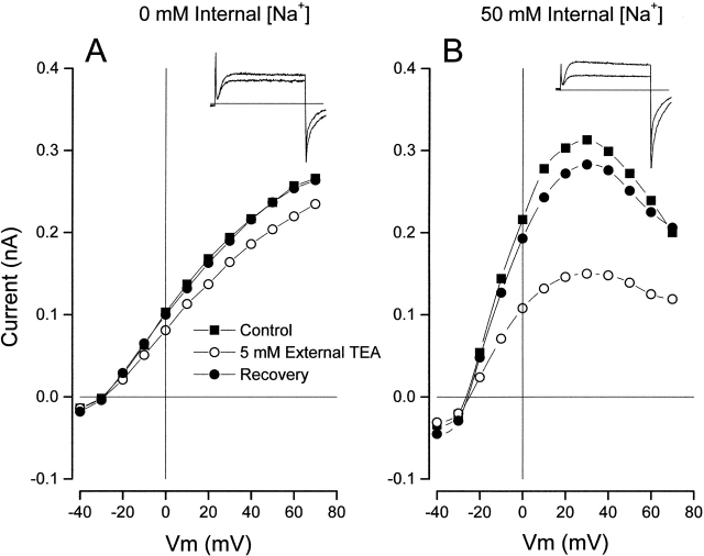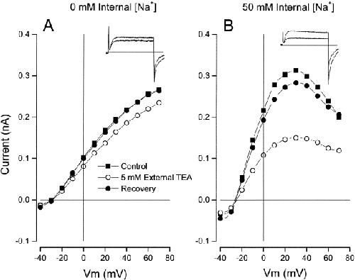 Figure 10. Internal Na+ ions and block by external TEA. (Left) Inset shows Shaker currents (at 0 mV) recorded in the absence (larger) and presence of 5 mM external TEA with an internal solution without Na+ ions. The main figure shows the Shaker channel current–voltage relation recorded before (▪), during (○), and after (•) recovery from application of 5 mM external TEA. Internal solution with 20 mM K+ and NMDG (see methods). (Right) Same as left, but data was recorded in the presence of 50 mM internal Na+ ions (and 20 mM K+).