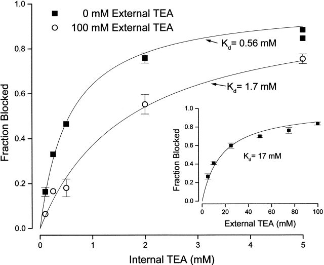 Figure 2. Channel block by internal TEA in the absence and presence of external TEA. Fraction block of Shaker channel current at the indicated internal TEA concentrations in the absence (▪) and presence (○) of 100 mM external TEA. Currents measured at 0 mV. (Solid lines) Fits of to the data with the indicated dissociation constants. Mean values of three measurements except at 5 mM TEAi in the absence of TEAo (two observations) and single measurements at 0.1 and 0.25 mM TEAi at 100 mM TEAo. For remaining data, standard error bars are omitted if smaller than symbol. (Inset) Channel block by external TEA. Block of Shaker current at a potential of 0 mV at the indicated concentrations of external TEA. Mean values from four to five measurements with SEM limits. (Line) Best fit of to the data with the indicated dissociation constant.