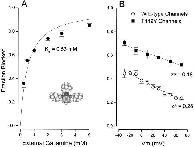 Figure 7. External gallamine block of Shaker K channels. (A) Block of Shaker channels (at 0 mV) by the indicated external gallamine concentration. (Solid line) Fit of to the data with the indicated value of the dissociation constant. Mean and SEM limits from three to five measurements, except as indicated. (Inset) Space-filling model of gallamine. (B) Voltage dependence of channel block by external gallamine. Block of wild-type (○) and T449Y (▪) channels by 0.25 mM external gallamine at the indicated membrane voltages. Lines are fits of to these data with the indicated values of zδ.
