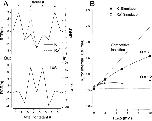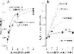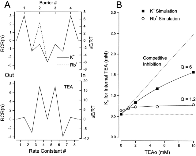 Figure 11. Simulation of apparent antagonism between external and internal TEA. (A, left ordinate) Rate constant representation (RCR, see methods) for (top) K+ (solid line) and Rb+ (dashed line) permeation of the model pore and for TEA block of the pore (bottom). (Right ordinate) Transition energies for the model using a frequency factor of 3 × 1011 s−1. The barrier heights would be three RT larger if the Eyring frequency factor (5.8 × 1012) were used. See text for details. The external solution is on the left side of the energy profiles. (B) Simulation of the apparent Kd for block by internal TEA as a function of the external TEA concentration with the K+ and Rb+ rate constants from A. Solid lines are fits of with the indicated values of Q for simulations with K+ (▪) and Rb+ (○) rate constants. In these simulations, external and internal ion concentrations were 10 and 150 mM, respectively. The size of the simulated current at 0 mV with the K+ ion rate constants was near 1 pA.