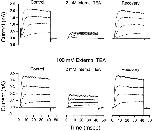 Figure 4. Lack of interaction between internal and external TEA in the presence of Rb+ ions. (Top) Shaker channel currents at several voltages before, during, and after recovery from application of 2 mM internal TEA with no TEA in the external solution. (Bottom) Currents from another patch before, during, and after recovery from application of 2 mM internal TEA with 100 mM TEA in the external solution. Currents elicited with 40-ms steps to voltages of −30, −10, +10, and +30 mV. Currents measured in K+-free, Rb+ solutions as described in methods.
