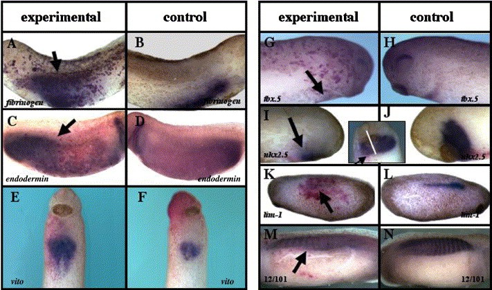 Fig. 1. Activation of Notch signaling using GRSu(H)VP16 increases expression of markers of endodermal cell types and decreases expression of markers of mesodermal cell types. (AâF) Increased expression of endodermal tissue markers (fibrinogen, endodermin, and vito) was observed in embryos injected with mRNAs encoding GRSu(H)VP16 as described in Materials and methods. Activation of the Notch pathway in gastrula stage embryos resulted in an increase of gene expression of the endodermal tissue marker, fibrinogen, on the injected side of embryos (A) when compared to the uninjected control side of embryos (B). (CâD) Similar effects were observed in GRSu(H)VP16-injected embryos examined for another endodermal tissue marker endodermin. Expansion of the normal region of expression of the early ventralmidgut endodermal marker, vito, was observed in GRSu(H)VP16-injected (DEX) embryos (E) when compared to the sibling-injected (no DEX) control stage-matched embryos (F). (GâN) In sharp contrast, expression of mesodermal tissue markers tbx5 (GâH), nkx2.5 (IâJ), lim-1 (KâL), and 12/101 (MâN) decreased or was completely ablated on the injected side of embryos when compared to the uninjected control sides of embryos (or no DEX control embryos, data not shown). In all experiments, mRNAs encoding β-galactosidase were co-injected as a lineage tracer (pink). Embryos were induced with dexamethasone at stages 10â12 and cultured until fixation at stages 22â33. Arrows indicate the injected side of embryos. Most embryos are oriented laterally except panels IâJ that include a ventral image shown in inset and ventral views of embryos shown in panels E and F. The white line denotes the midline of the embryo.