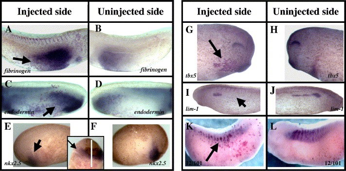 Fig. 2. Activation of Notch signaling using GRNotchICD increases expression of markers of endodermal cell types and decreases expression of markers of mesodermal cell types. The Notch pathway was activated by co-injection of mRNAs encoding a temporally inducible GRNotchICD and the lineage tracer β-galactosidase (pink). Injected constructs were induced with dexamethasone at stages 10â12 and cultured until fixation at stages 22â33. Similar to the results seen in GRSu(H)VP16-injected embryos, activation of the Notch pathway via GRNotchICD resulted in an increase in gene expression of the endodermal markers fibrinogen and endodermin (A, C) when compared to the control side of the embryos (B, D). Comparable to patterns observed in GRSu(H)VP16-injected embryos, expression of the mesodermal tissue markers nkx2.5, tbx5, and lim-1 (E, G, I) decreased or were completely eliminated on the GRNotchICD-injected side of embryos when compared to the uninjected control sides (F, H, J). Immunohistochemistry revealed a decrease in expression of a molecular marker of the somites 12/101 (KâL). Arrows indicate the injected side of embryos. All embryos are oriented laterally except panels EâF that contain an inset ventral image. The white line denotes the midline of the embryo.
