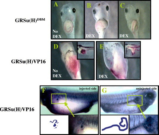 Fig. 6. Activation and suppression of Notch signaling result in morphological anomalies of the gut and perturbation of a molecular marker of pronephric duct cells. (AâC) Ventral views of embryos injected with inducible mRNAs encoding dominant negative Su(H) [GRSu(H)DBM] and induced at stage 10 to suppress Notch signaling. Injected tadpoles displayed miscoiling of the gut (B, C) in comparison to the normal coiling pattern observed in injected embryos cultured in the absence of DEX (no DEX) (A). (DâE) Ventral views with lateral inset images of embryos injected with mRNA encoding Su(H) [GRSu(H)VP16] and induced at stage 10 to activate Notch signaling. Panel E illustrates gut malformation observed in embryos exposed to DEX compared to normal phenotypes observed in injected no DEX sibling control embryos (D). (FâG) Lateral image of embryo injected with mRNA encoding Su(H) [GRSu(H)VP16] and induced at stage 10 to activate Notch signaling. Activation of Notch signaling substantially decreased expression of a late marker for pronephric duct cells 4A6 (F). Left bottom panels show schematic tracing of the observed 4A6 expression pattern. Right bottom panel shows a magnification of boxed areas.