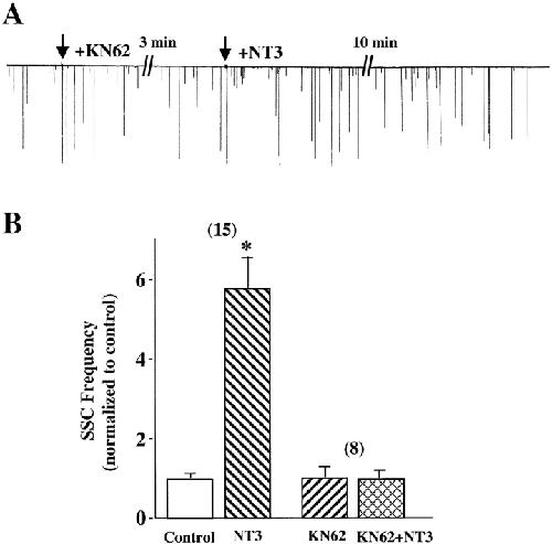 Figure 4. Effect of KN62 on NT3-induced synaptic potentiation. (A) A sample recording showing that pretreatment of the neuromuscular synapse with KN62 prevents the NT3-induced facilitation of transmitter release. (B) Blockade of NT3-induced synaptic potentiation of SSC frequency by KN62. In KN62 groups, the nerve–muscle cultures were pretreated with KN62 for 10–20 min before application of NT3. The number of synapses recorded are indicated above each pair of columns. In each experiment, SSC frequency was calculated from a 10-min recording period, and then the number after NT3 treatment was normalized to that before NT3 application. Asterisk indicates P < 0.01, t test.