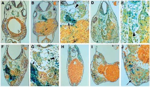 Fig. 3. Hex-lVP2 induces dorsal mesoderm. Transverse sections through embryos described in Fig. 2. Dark blue stain is b-galactosidase
