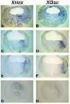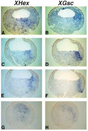 Xenopus embryos with probes to Hex and Gsc. A,C,E and G are
