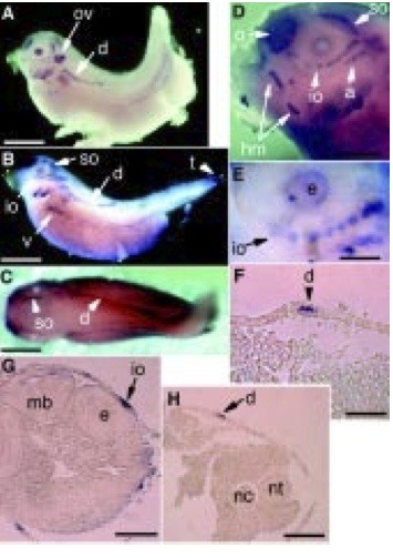 Fig. 4. Expression of xPAK during lateral line development. (A) Stage 35/36, (B-H) stage 37/38. (A-E) Whole-mount in situ hybridization. (F,G and H) Transverse sections of stage 37/38 whole mount embryos sectioned after hybridization with xPAK1. ov, otic vesicle; o, olefactory placode; nc, notochord; e, eye; a, d, io, so, hm, respectively the aortic, dorsal, infraor- bital, supraorbital and hyomandibular lateral lines; t, tail. Bar in A to C,1 mm; in D, 0.3 mm; in E and F, 0.16 mm; and in G and H, 0.3 mm.