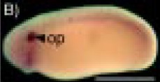 Fig. 3. Expression of xPAK1 in the otic placode and vesicle. Lateral views of whole-mount in situ hybridization of xPAK1 transcripts in X. laevis embryos at (A) stage 23/24, (B) stage 25, (C) stage 26, dorso-lateral view, (D) stage 29. (G-H) Sequential sections of a xPAK1 hybridized stage 29/30. (I) Whole-mount TUNEL staining [(Hensey and Gautier, 1998) as modified by Poitras et al. manuscript submitted] of anterior region of a stage 27 embryo. (J) Magnified view of TUNEL staining over the eye of a stage 27 embryo showing colocalization of stain with cell nuclei, as revealed by Hoechst 33258 fluorescence. Op, otic placode; ov, otic vesicle. Bar in A to D, 1 mm; in E to H, 50 μm; in I 0.5 mm; and in J 100 μm.