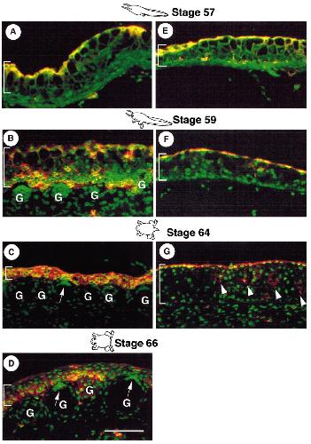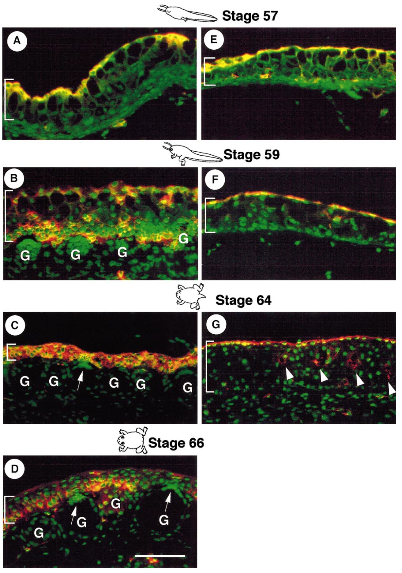 epidermis at stage 64 (arrowheads in G). The letter G in B, C, and D indicates the developing granular gland. Arrows in C and D indicate