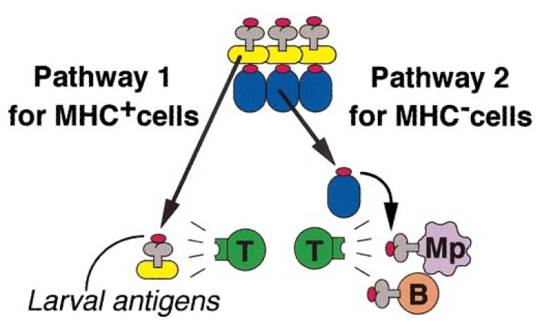 recognize the larval-specific antigens (red ball) on the MHC class II