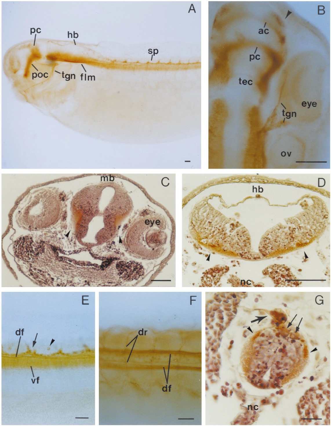 postoptic commissure; sp, spinal cord; tec, optic tectum; tgn, trigeminal nerve; vf, ventral fascicle. Scale bars, 100 mm (AâF); 200 mm (G).
