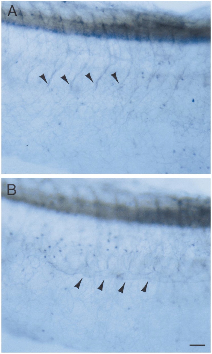 the intramyotomal fascicles (arrowheads) and further ventral extension