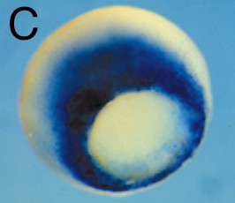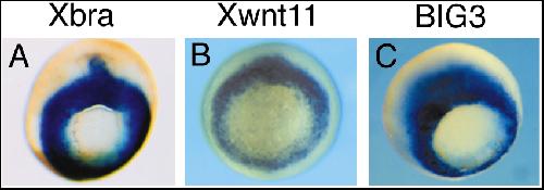 Fig. 2. Expression patterns of Xbra (A), Xwnt11 (B) and BIG3 (C) at the mid-gastrula stage.
