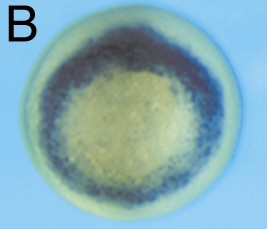 1a11 (71 kDa protein) gene expression in Xenopus laevis embryo, assayed via in situ hybridization, NF stage 10.5, vegetal view dorsal up.