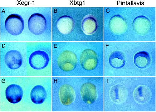 Fig. 5. Expression patterns of Xegr-1 (A,D,G), Xbtg1 (B,E,H) and Pintallavis (C,F,I), at early- (AâC), mid- (DâF) and late- (GâI) gastrula stages. Note the similar expression patterns of these three genes from early to mid-gastrula stages.