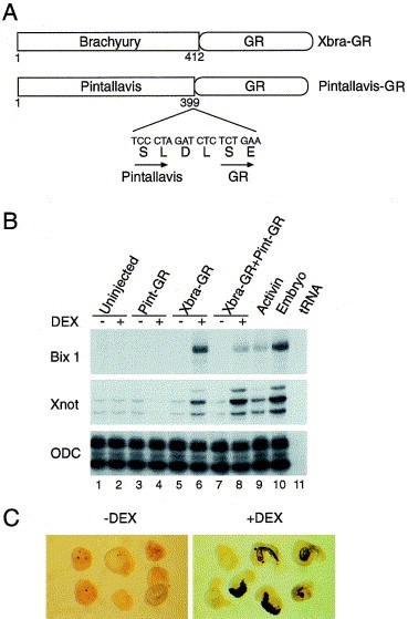 Fig. 1. Hormone-dependent induction of notochord in animal cap tissues by co-expression of Xbra-GR and Pintallavis-GR. (A) Schematic illustration of hormone-inducible Xbra and Pintallavis. The hormone-binding domain of the human glucocorticoid receptor (GR) was fused to the carboxy-terminus of full length Xbra and Pintallavis. Stop codons of both genes were replaced with two amino acids (D and L) creating a BglII site (AGATCT) (see Tada et al., 1997). (B) RNAase protection assay of Bix1, a direct target of Xbra, and Xnot in animal caps expressing either Xbra-GR or Pintallavis-GR alone or a combination of the two. Pintallavis-GR alone could not induce either Bix1 or Xnot. Bix1 and Xnot were induced by Xbra-GR alone in a hormone (DEX)-dependent manner. Bix1 expression was induced by co-expression of Xbra-GR and Pintallavis-GR but at a slightly reduced level, while Xnot expression was enhanced. (C) DEX-dependent notochord formation in animal caps co-expressing Xbra-GR and Pintallavis-GR. Animal caps were fixed at stage 41 and stained with the notochord-specific antibody MZ15. Neither Xbra-GR nor Pintallavis-GR alone could induce ectopic notochord formation in animal caps (data not shown).