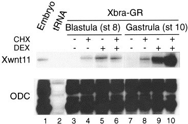 Fig. 3. Xwnt11 is a direct target of Xbra. Animal caps expressing Xbra-GR were dissected at stage 8 and were either left untreated or were treated with DEX in the presence or absence of cycloheximide (CHX) from stage 8 or 10 for 3 h. ODC serves as a loading control. Expression of Xwnt11 is induced by DEX even in the presence of cycloheximide.