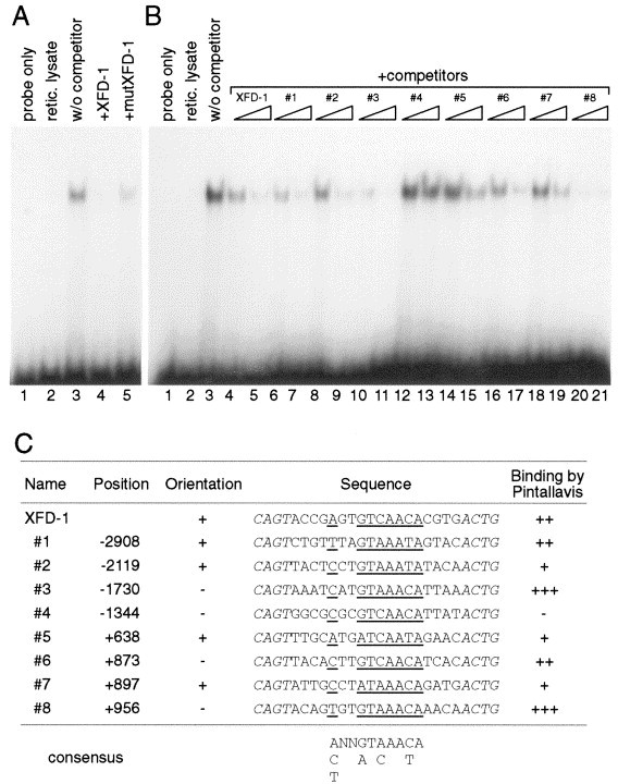 Fig. 7. Pintallavis is capable of binding to several target sites present in the promoter and in the first intron of the Xegr-1 gene. (A) Gel-shift assays showing that Pintallavis protein binds in vitro to a DNA recognition sequence (XFD-1 in C) (Kaufmann et al., 1995). 32P-Labelled XFD-1 probe was incubated with either reticulocyte lysate alone (lane 2) or with Pintallavis protein synthesized in vitro by reticulocyte lysate (lane 3). Competition was carried out by incubating the Pintallavis protein, prior to the addition of the 32P probe, with a 100-fold excess of unlabelled XFD-1 (lane 4) or a mutated version of XFD-1 (mutXFD-1; lane 5) which has a single base substitution (GTCAACA to TTCAACA in the 7 base pair core sequence of the consensus). The retarded band was competed out by the XFD-1 (lane 4) but not by mutXFD-1 (lane 5), showing that the DNA-protein complex formation is specific. (B) Competition experiments using the double-stranded oligonucleotides listed in (C) as cold competitors. In vitro synthesized Pintallavis protein was incubated either without competitor (lane 3) or with 10- (even-numbered lanes) or 50-fold excess (odd-numbered lanes) of unlabelled competitors indicated above (lanes 4â21), prior to the addition of 32P-labelled XFD-1 probe. (C) The sequences of double-stranded oligonucleotides used in the gel retardation assay. The central 18 base pair of all sequences are flanked by CAGT at the 5â² end and ACGT at the 3â² end for 32P-labelling, which are indicated by italics. The sequence of XFD-1 is adopted from one of the three DNA recognition sites selected by PCR-based binding site selection (Kaufmann et al., 1995). The consensus sequence is compiled from the results of the binding-site selection (Kaufmann et al., 1995). The central 18 base pair sequence of #1 to #4 can be found in the 5â² upstream region and those of #5 to #8 in the first intron of Xegr-1 (Panitz et al., 1998). Nucleotide positions are relative to the transcription start site. Sequences which match the consensus are underlined. The orientation of the sequences relative to the direction of transcription are also indicated. The binding strength determined by the competition assays are indicated on the right most column.