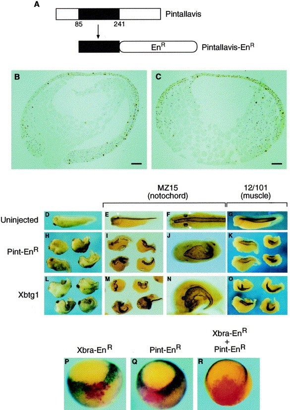 Fig. 8. Xbtg1 is a target of both Xbra and Pintallavis and its overexpression blocks gastrulation movements. (A) Construction of Pintallavis-EnR. The repressor domain of the Drosophila Engrailed protein was fused to the carboxy terminus of the DNA-binding domain of Pintallavis (amino acids 85â241). (B,C) Overexpression of Xbtg1 inhibits gastrulation movements. (B) Section of control stage 12 embryo. (C) Sibling embryo injected with 1 ng Xbtg1 RNA. Gastrulation movements are inhibited. Sections in (B,C) are stained by the Feulgen technique to visualize nuclei (purple) and with an antibody specific for phosphorylated histone H3 to reveal mitotic nuclei (brown). (DâO) Phenotypes of control embryos or embryos injected with Pintallavis-EnR or Xbtg1. Embryos were fixed at stage 35/36 and stained either with notochord-specific antibody MZ15 (E,F,I,J,M,N) or muscle-specific antibody 12/101 (G,K,O). Otic vesicles are indicated by arrowheads in (E,F). Embryos injected with Pintallavis-EnR or Xbtg1 frequently had enlarged notochords (compare (F), a control uninjected embryo, with (J), an embryo injected with Pintallavis-EnR, and (N), an embryo injected with Xbtg1; all three are dorsal views at the same magnification). (PâR) Suppression of Xbtg1 expression by Xbra-EnR and Pintallavis-EnR. A single cell of embryos at the 8- or 32-cell stage was injected with Xbra-EnR (P), Pintallavis-EnR (Q) or both (R), together with lineage tracer Fluorescein-dextran (red). The injected embryos were fixed at stage 10.5 and were hybridized with Xbtg1 probe (blue).
